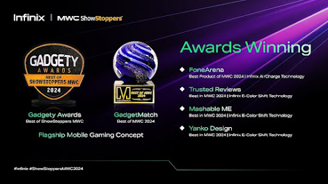 Infinix proudly received the esteemed Gadgety Awards, recognizing the best and most cutting-edge consumer electronics in the world. This award, titled Best of Showstopper MWC 2024, was bestowed upon Infinix's first dual-core flagship mobile gaming concept technology, showcasing their commitment to pushing the boundaries of mobile gaming. Additionally, Infinix's groundbreaking technology received another notable award from GadgetMatch, a top-tier technology media outlet, for 'Best of MWC 2024'.